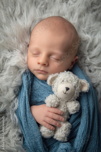 Fototapeta premium A serene scene of a newborn baby resting in a cozy studio, wrapped in a soft blue blanket while clutching a small plush teddy bear. The gentle environment creates a tranquil atmosphere