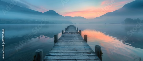© Starkreal, Obraz premium A serene scene of a wooden pier extending into a calm lake at sunrise, with mist rising from the water and mountains in the distance