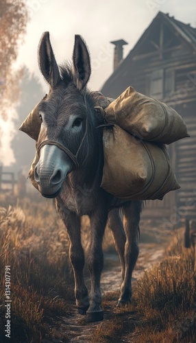 © Yurij, Fototapeta premium A serene scene of an old donkey carrying farm materials at dawn with a rustic farmhouse background