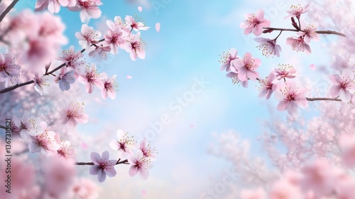 © Kamisama, Obraz premium A serene scene of cherry blossoms against a soft blue background.