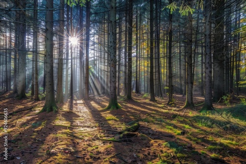 © Fotograf, Obraz premium A serene scene with sunlight peeking through tree branches in a dense forest