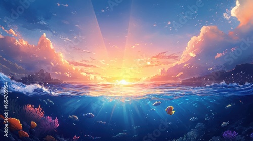 Fototapeta premium A serene seascape at sunrise, with coral reefs and fish.