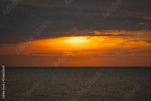© pandaclub23, Obraz premium A serene seascape with a distant island silhouetted against the twilight sky
