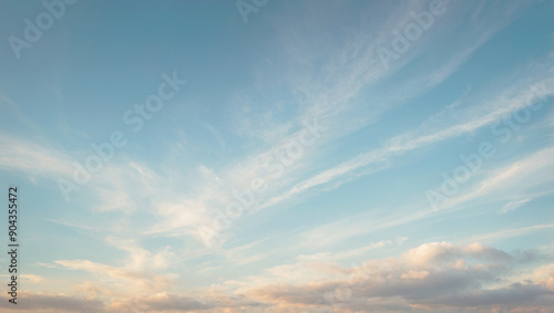 Obraz premium A serene sky featuring a soft blue background with wispy, white clouds gently...