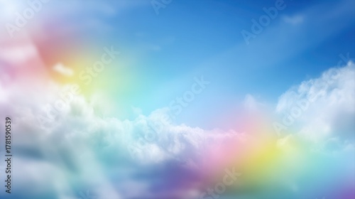 Obraz premium A serene sky with soft clouds and a subtle rainbow effect, a tranquil and uplifting atmosphere, blurred rainbow background