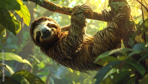 © Nabil, Naklejka premium A serene sloth hangs lazily from a tree branch.