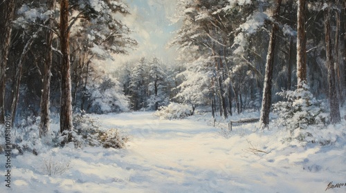 © Chatchanan, Fototapeta premium A serene snow-covered forest clearing, surrounded