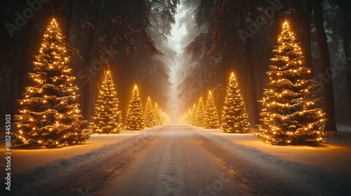 Fototapeta premium A serene snowy path leads through a dark forest, illuminated by shining Christmas trees