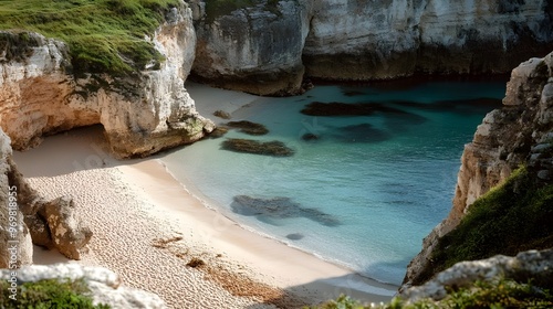 Fototapeta premium A serene stock photo of a secluded beach cove with rugged cliffs surrounding...