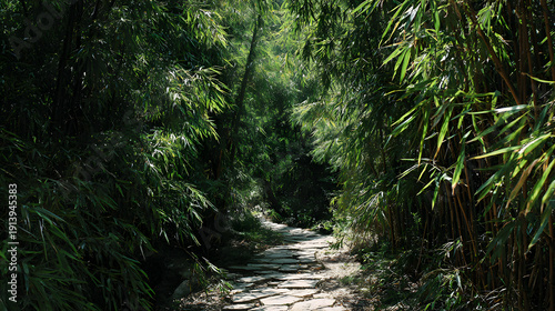 © Muhammad, Obraz premium A serene stone pathway winds through a dense bamboo forest with dappled sunlight filtering through the lush green foliage.