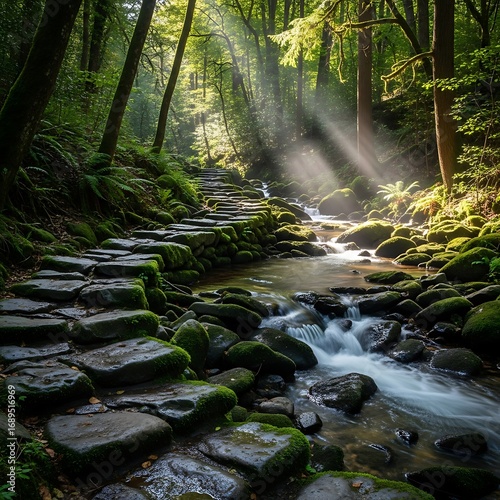 © Jatmiko, Obraz premium A serene stone pathway winds through a lush forest, sunlight streaming down through the trees onto a rushing brook.