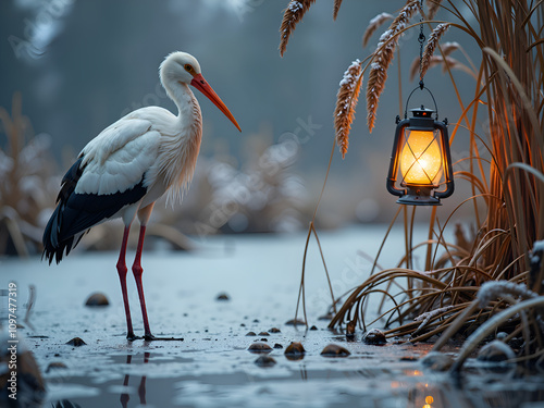 Fototapeta premium A serene stork standing by a lantern in a misty marsh at dawn, photorealistic...