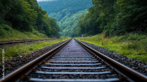 Fototapeta premium A serene, straight railway track surrounded by dense, lush green forests and hills, perfect for themes of travel, tranquility, nature, and journey in editorial or commercial use,