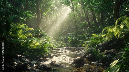 Fototapeta premium A Serene Stream Flowing Through a Lush, Sun-Dappled Rainforest