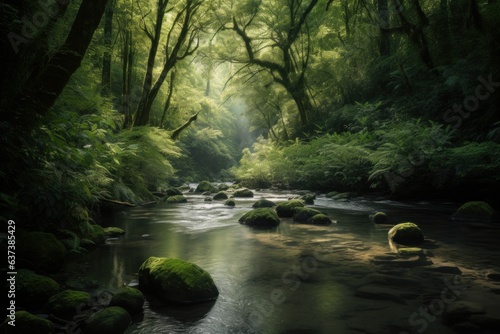 Fototapeta premium A serene stream flowing through a vibrant green forest