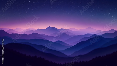 Fototapeta premium A serene, stylized mountain landscape at twilight or dawn with layered silhouettes of mountains against a gradient sky of purples and pinks, dotted with stars.