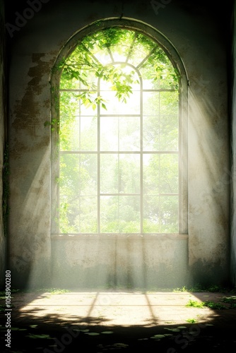 Fototapeta premium A serene, sunlit abandoned room featuring an arched window overgrown with greenery, creating an ethereal atmosphere, Ideal for themes of nature, decay, tranquility, or restoration,