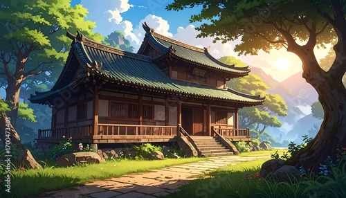 © Iyat, Obraz premium A serene, sunlit Asian-inspired temple nestled amidst lush greenery and rolling hills.