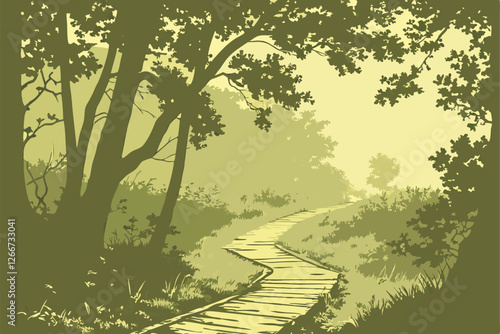 Naklejka premium A serene, sunlit forest path, framed by lush green foliage and tall trees, winding through the dense underbrush. The path is made of wooden planks, slightly worn and weathered, leading into the dis