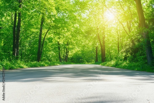 Obraz premium A serene, sunlit road lined with lush green trees, inviting exploration and...