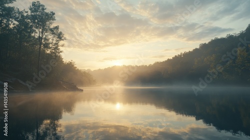 © ida, Fototapeta premium A serene sunrise illuminates a misty lake surrounded by trees and mountains