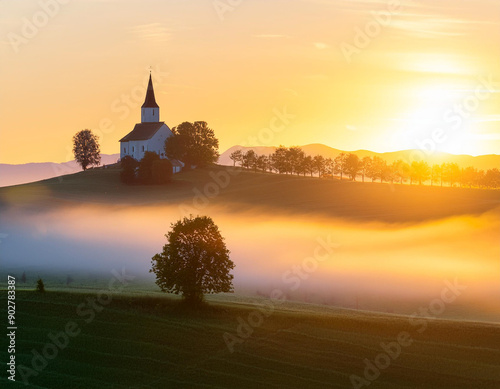 © sebi_2569, Obraz premium A serene sunrise landscape with a church on a hill surrounded by mist