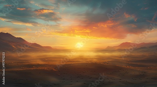 © peeter, Fototapeta premium A serene sunrise over a desert landscape with the sky filled with warm colors.