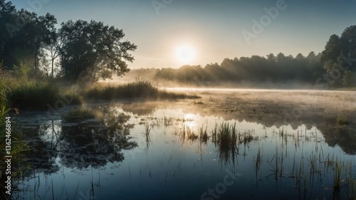 Fototapeta premium A serene sunrise over a misty lake, reflecting nature's beauty and tranquility.