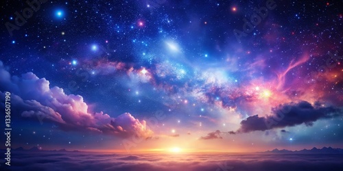 © NongPim, Fototapeta premium A Serene Sunrise Over a Sea of Clouds with a Vibrant Starry Night Sky Above