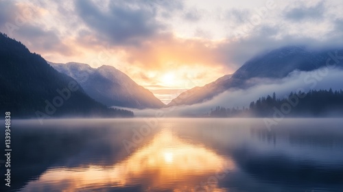 © Abbas, Fototapeta premium A serene sunrise over a tranquil lake surrounded by misty mountains.