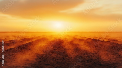 Obraz premium A serene sunset casts a golden hue over farmland, with dust swirling gently...