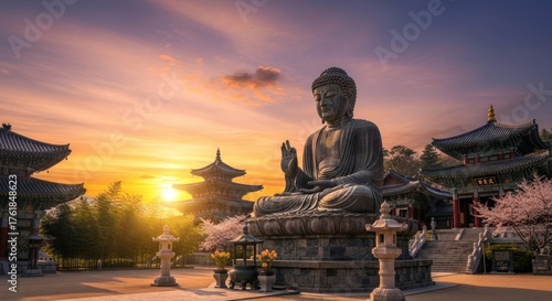 © Telrkmark, Fototapeta premium A serene sunset illuminates a large seated Buddha statue within a temple complex.