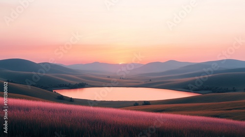 Fototapeta premium A Serene Sunset Over a Calm Lake Surrounded by Rolling Hills and Vibrant Wildflowers in Summer