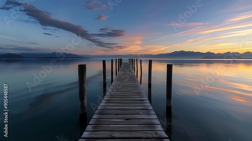 Fototapeta premium A serene sunset over a calm lake, with a wooden pier extending into the water...