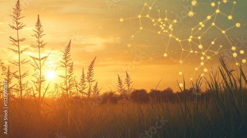 Fototapeta premium A serene sunset over a field with abstract connections symbolizing nature and...
