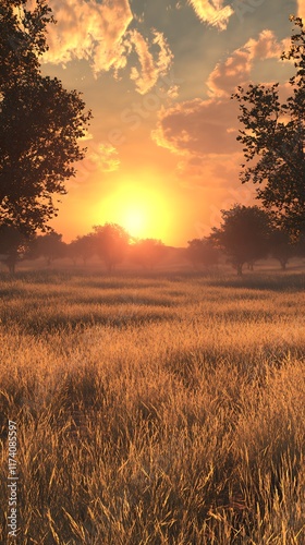 Obraz premium A serene sunset over a grassy field, evoking tranquility and natural beauty.