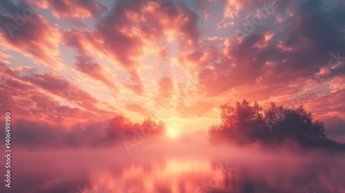 Fototapeta premium A serene sunset over a misty lake, with vibrant clouds reflecting warm hues,...