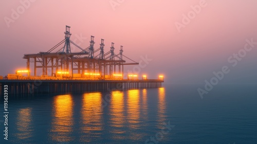 Obraz premium A serene sunset over a pier with cranes, reflecting lights in calm waters,...