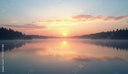 © MHK01, Fototapeta premium A serene sunset over a still lake, mirror reflection of sky and clouds