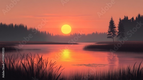 Obraz premium A serene sunset over a tranquil lake, surrounded by trees and gentle grassland.