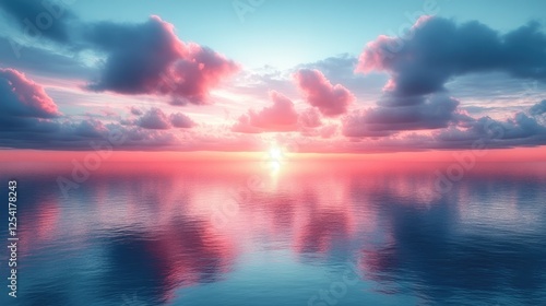 © Stockfish, Fototapeta premium A serene sunset over calm waters, reflecting vibrant colors and fluffy clouds.