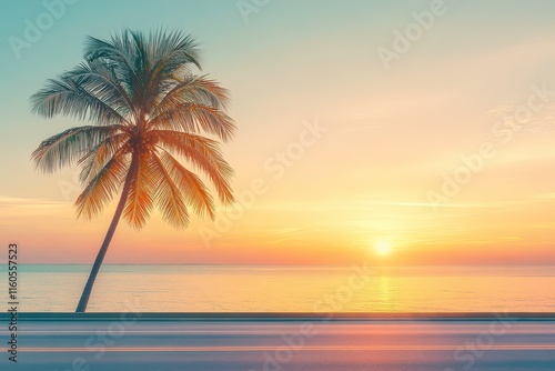 Fototapeta premium A serene sunset over the ocean with a palm tree silhouetted against the...
