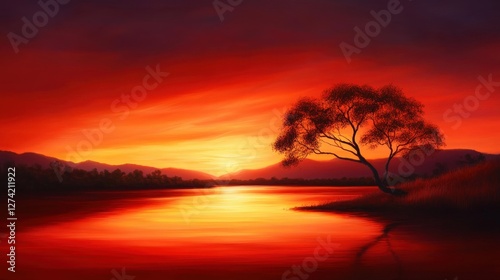 © Alex, Fototapeta premium A serene sunset reflecting vibrant hues of orange and red over a calm lake, accompanied by the silhouette of a lone tree and distant hills, creating a tranquil atmosphere.