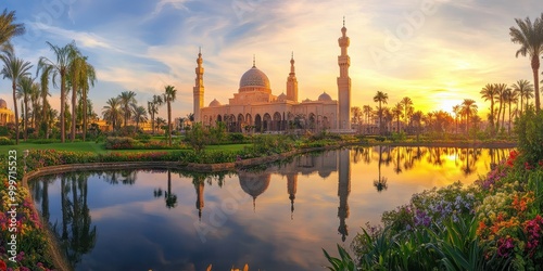 Naklejka premium A serene sunset view of a mosque reflected in a tranquil pond surrounded by...