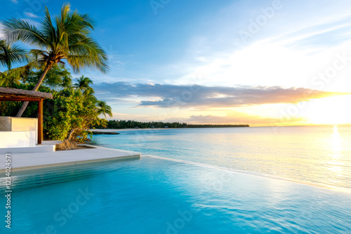 Fototapeta premium A serene sunset view over a tranquil pool, surrounded by palm trees and a calm ocean, creating a perfect tropical getaway atmosphere.