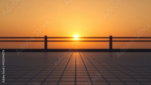 © CoreVisuals, Obraz premium A serene sunset view with a warm orange glow, framed by a railing and reflecting on a tiled surface, creating a tranquil atmosphere.