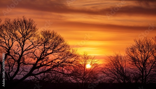 © Freya, Fototapeta premium a serene sunset with the sun partially visible on the horizon casting an orange glow across the sky bare tree branches are silhouetted against the colorful sky with a few other trees visible