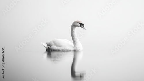 Fototapeta premium A serene swan glides gracefully across a calm, misty water surface, reflecting a tranquil ambiance in monochrome tones.