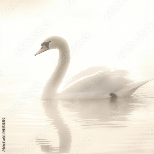 Fototapeta premium A serene swan gliding gracefully on a misty water surface.