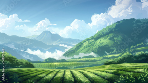 © Santy Hong, Obraz premium A serene tea landscape with endless green rows, framed by majestic mountains and fluffy white clouds,